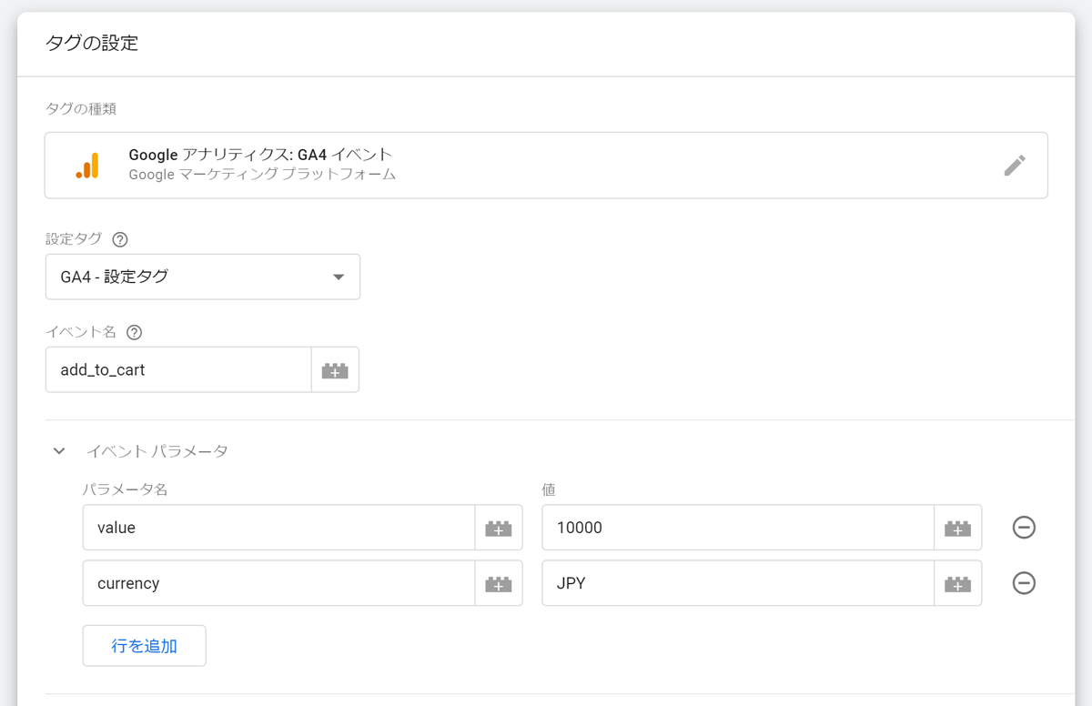 次にイベント名に推奨イベントかカスタムイベントを打ち込みます。イベントパラメータやユーザープロパティも任意で設定可能になっています。以下の例では通貨(currency)を日本円(JPY)に、金額(value)を10,000に設定しています。この値の部分はもちろんデータレイヤーなどを使って動的に設定することも可能です。