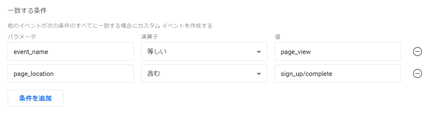 カスタムイベントのカラムには任意のイベント名を入れます。次に「一致する条件」でイベントを発火させる条件を指定していきます。この条件は自由に設定できるのですが、ここでは例として、特定URLのページビューでイベントを計測する方法をご紹介します。