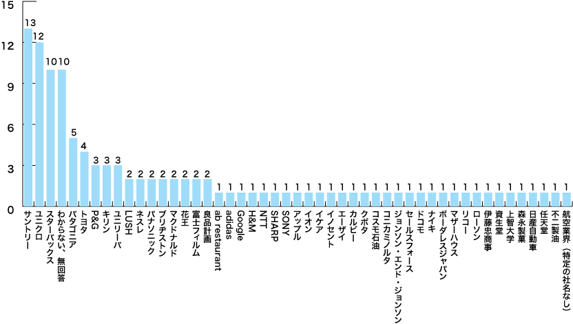 1位のサントリー、2位のユニクロは、社会貢献をしている(していそうな)企業名を挙げさせた時にもよく出てくる2社です。