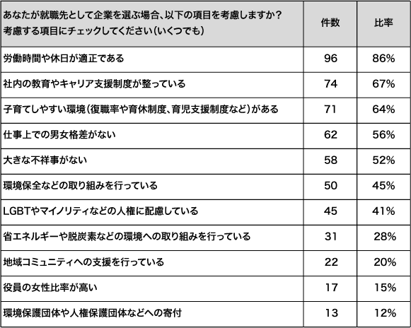 40%を超えたのが「LGBTやマイノリティなどの人権に配慮している」「環境保全への取り組みを行っている」「大きな不祥事がない」「仕事上での男女格差がない」「子育てしやすい環境(復職率や育休制度、育児支援制度など)がある」「社内の教育やキャリア支援制度が整っている」「労働時間や休日が適正である」など、環境、社会、ガバナンスのいわゆるESG要素がしっかり入ってきています。