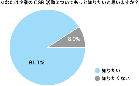 また、授業などで企業のCSR活動などを紹介する際、必ず挙がるのが「こういう活動をしているなら企業はもっと言って(知らせて)ほしい」というものです。実際、企業のCSR活動について知りたいかを聞くと、90%以上が「知りたい」と回答しています。