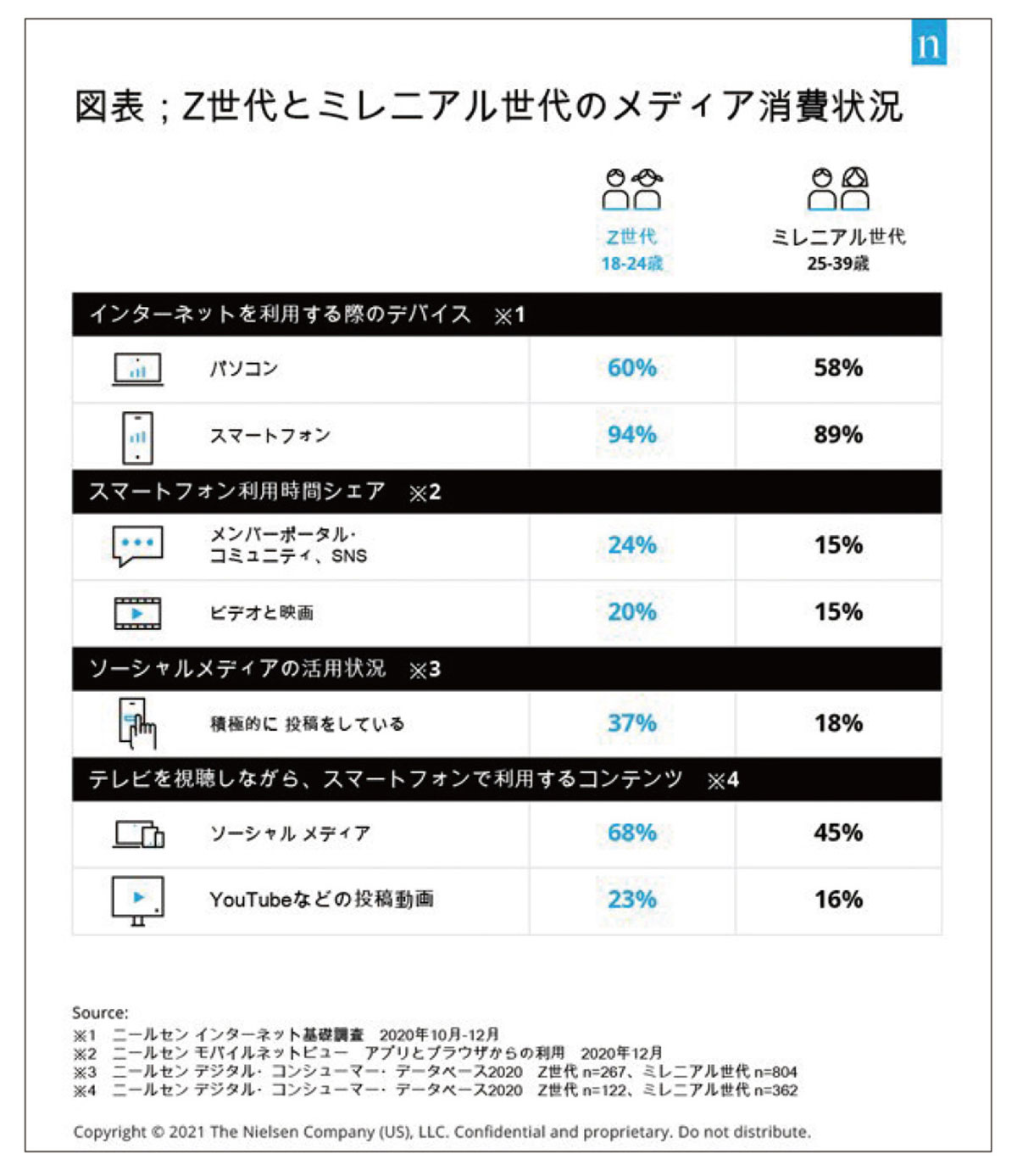 どの世代でもSNSをコミュニケーションの場として利用しているため、若年層以外でも十分アプローチは可能です。しかし、利用頻度で見ると、若年層になればなるほどSNSの影響度は大きくなります。18〜24歳のZ世代と25〜39歳のミレニアル世代を比較したところ(図表4)、スマートフォン利用時間シェアのうちZ世代はSNSに24%、ビデオと映画に20%使っており、ミレニアル世代よりもシェアが大きくなっています(SNS、ビデオと映画ともに15%)。