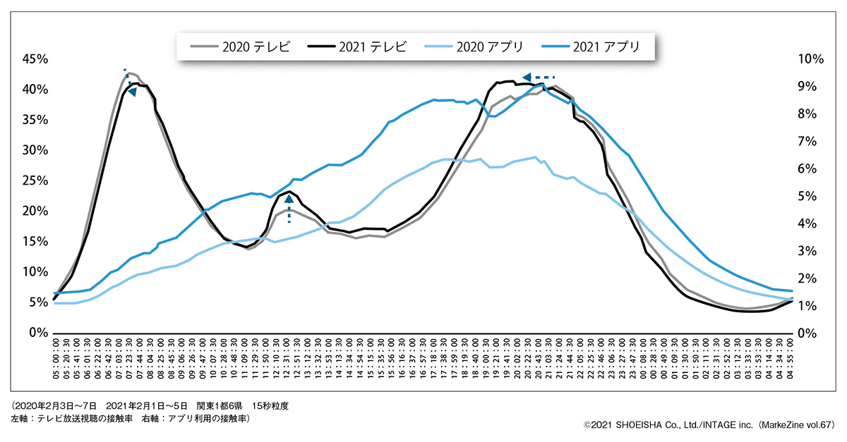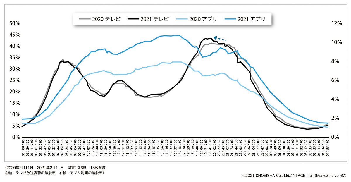 コロナ前後でアプリ利用の山の形自体には変化がありませんが、利用率が全体的に伸びていることも着目するポイントでしょう。2021年のデータでは最もテレビ視聴とアプリ視聴の差が縮まる休日の15時頃、視聴時間の割合がテレビ:アプリでほぼ2:1になっています。ここからイメージされるのは、休日をテレビの大画面で動画を見ながら過ごしつつ、ご飯を食べる時間にはテレビ番組にスイッチして団らんの時を過ごす家族のワンシーンかもしれませんし、一人暮らしでもご飯の時間はテレビのニュースや情報番組でコロナ関連の情報をキャッチする様子かもしれません。
