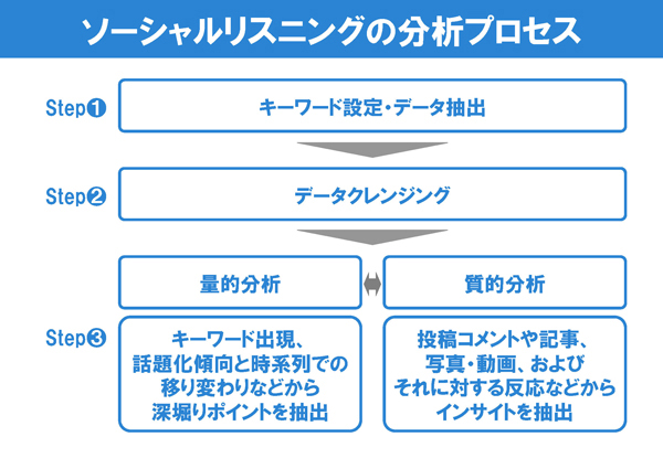 一般的に行われているソーシャルリスニングの分析プロセスを見てみます。基本的に、次のような手順を踏んで進められています。