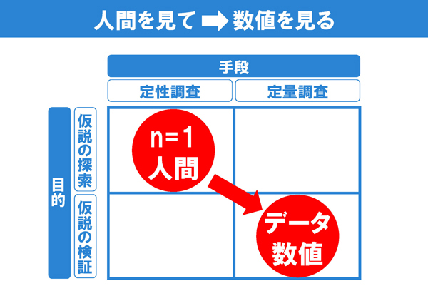 この順番を守ることが重要です。n=1に目を向け、定性調査によって仮説を手にする。その仮説を、定量調査によって論理的に検証する。この流れが大切です。
