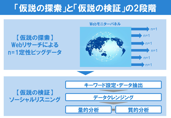 仮説の探索として私たちが行っているのは、Webリサーチによる「n=1定性ビッグデータ」の収集です。n=1の消費者の定性情報を効率的に膨大に収集し、そうして得られたn=1の情報から消費者の欲求における「新しい兆し」を発見します。