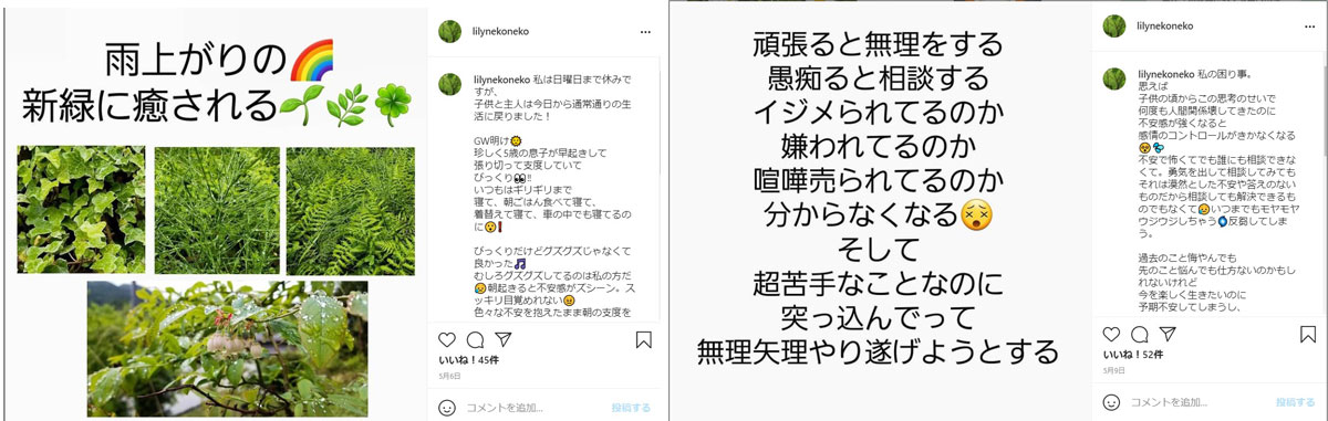 - ・写真は様々だが、基本的には自分の精神状態や体調について言及する投稿が多い。自分に言い聞かせるように自己を肯定する投稿もある