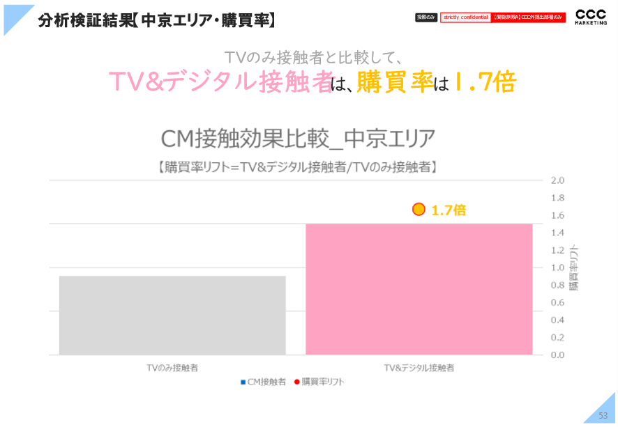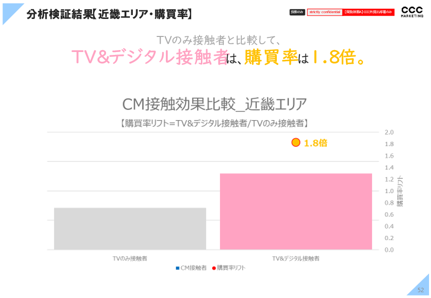 関西エリアでは、テレビのみ接触者より、テレビとデジタル双方の接触者が、実際の購買率が1.8倍に、中京エリアでも同じく1.7倍になっています。これ以外のケースでも同様の結果が出ており、テレビCMとデジタル広告を同じターゲットセグメントに重複接触させることで購買行動を促進させる効果があると考えられます。
