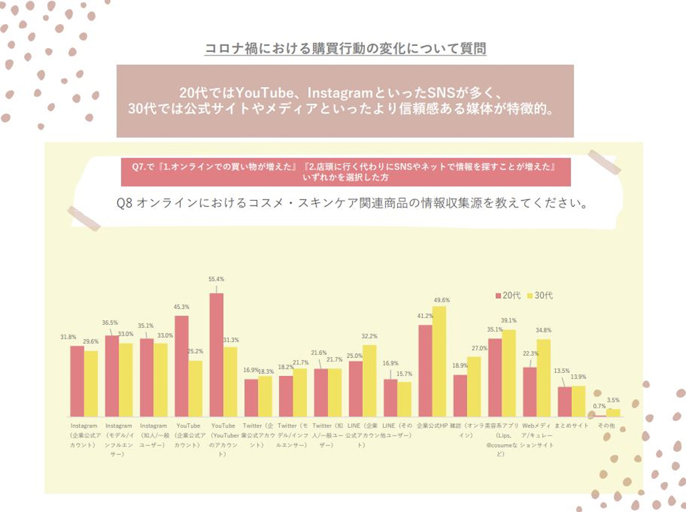 そうした状況の中、GLAPentertainmentが20代女性に行った調査によると、コスメ商品の情報収集源はYouTuberの動画が55%、企業公式YouTubeアカウントの動画が45%と1位2位がYouTubeの動画となっています。