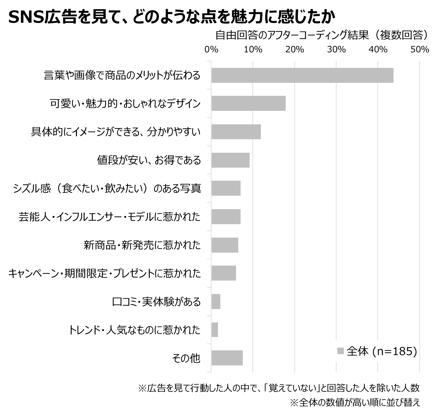 以下の図は、何らかの行動を起こすきっかけになったSNSの広告について、惹かれた・気になったポイントを自由回答形式で聴取して、その回答内容をコーディングしグラフ化したものです。