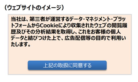 大井:下記の「ウェブサイトのイメージ」のように、たとえば、ECサイトのユーザー登録時においてクリックを押してもらうことで同意を取得することが想定されます。その場合の同意取得のためのワーディングとしては、「パブリックDMPからCookieにより収集されたウェブサイトの閲覧履歴及びその分析結果から得られたセグメントデータを取得し、これを自社のCRMデータと結びつけてユーザーの属性を解析すること、またターゲティング広告を出稿する目的で利用します」と説明すればよいです。