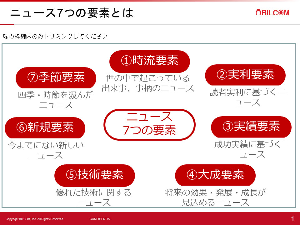 ニュース価値を高めるためには、ブランドイン(企業が発信したいこと)とメディアアウト(メディアが扱いたいこと)の両面から、PRメッセージやコンテンツを考える必要があります。当社ではそれらを考える際のフレームワークとして、「ニュース7つの要素」を定義しています(図表2)。