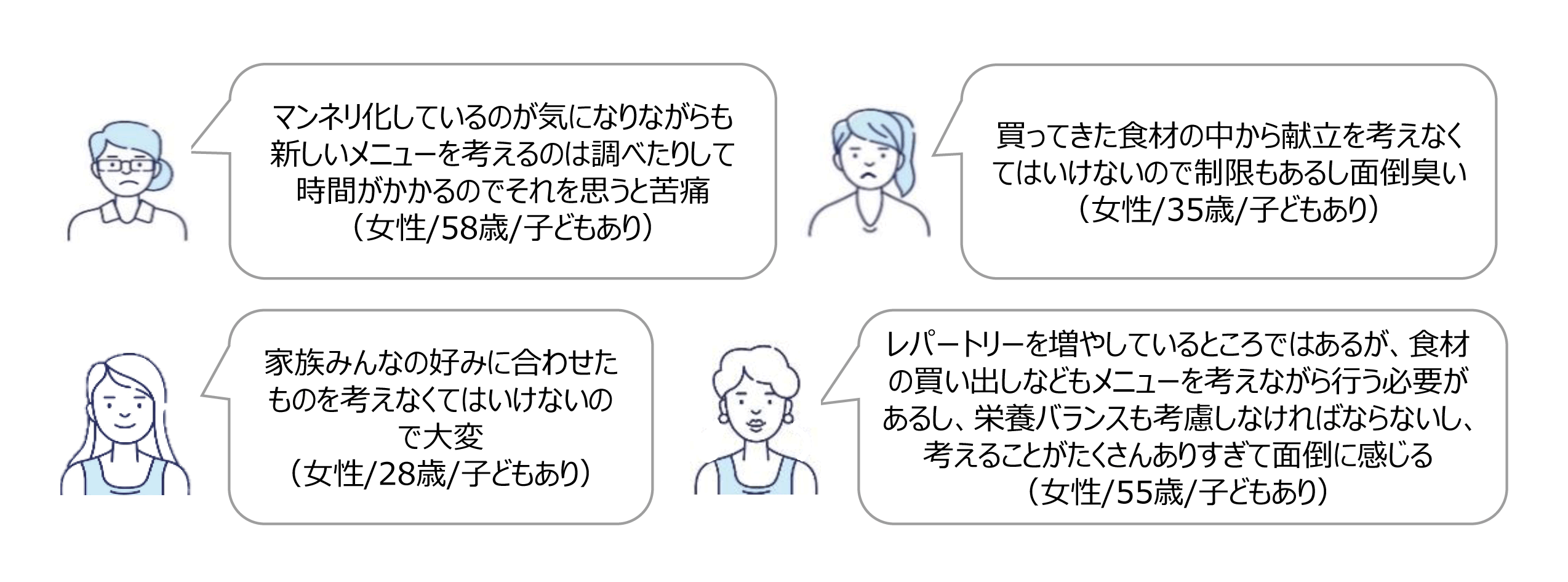 また、考えることが面倒で結局は似たようなメニューにしてしまい、マンネリ化するというパターンに陥る人々も、インタビューで多数見受けられました。