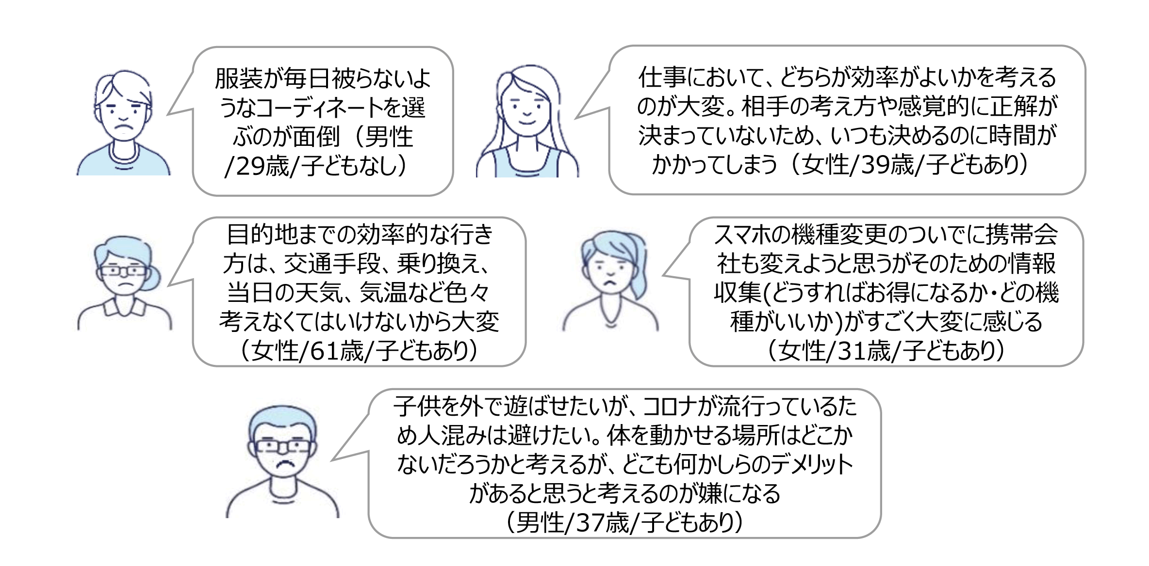 「仕事の段取り」については男性が多く、子ありの20‐40代では42.9%、子どもがいない20‐40代でも24.1%の人が面倒だと感じていました。また、子ありの20‐40代の女性は食事のメニュー以外にも、「洋服を選ぶ」で29.4%、「調べものや情報収集について」で31.8%、「外出における段取り」で31.8%と割合が高い項目が多く、さまざまな場面で面倒だと思っており、考えていることに疲れている様子がうかがえます。