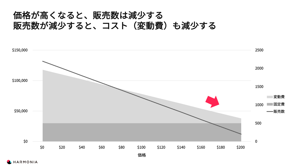 横軸に価格を取り、縦軸に売上・利益と販売数を取ったグラフです。価格が高くなるほど販売数が減少するということで、販売数のグラフは右下がりです。販売数が少ないということは変動費も小さくなります。