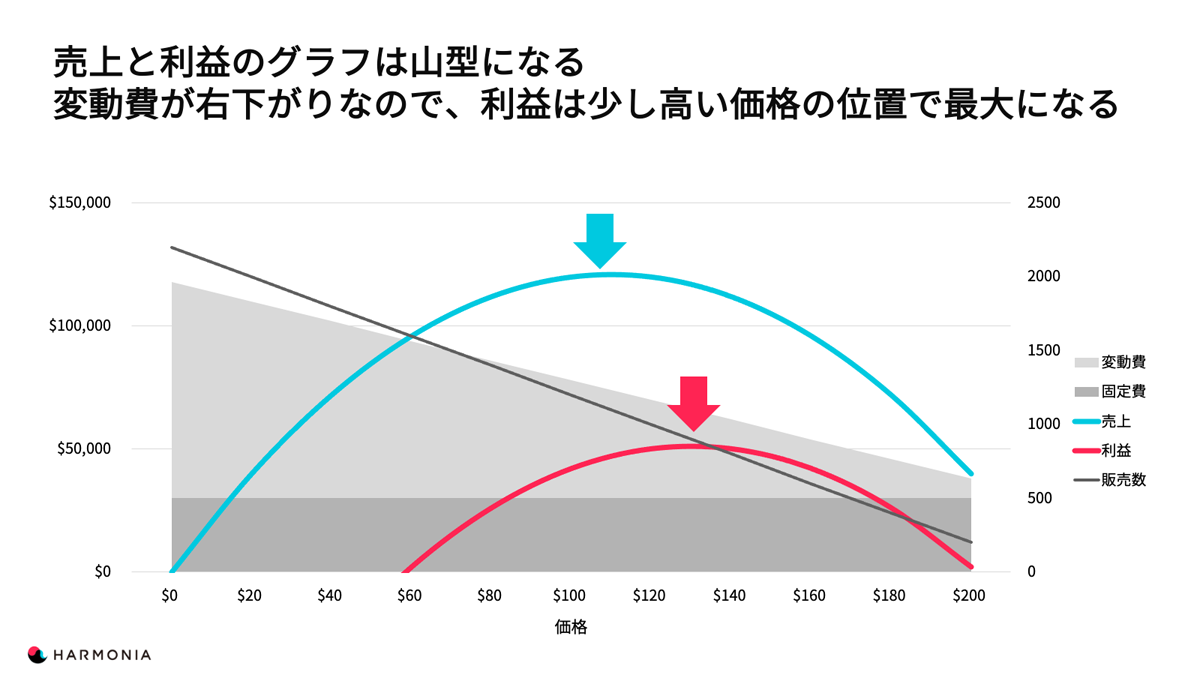先ほどの計算に基づいて、価格と売上・利益の関係を表すと山型のグラフになります。価格がゼロなら売上も当然ゼロ。そこから価格を上げていくことで売上も上がりますが、どこかのポイントでピークを迎え、価格を高くしすぎると今度は売上が下がっていきます。