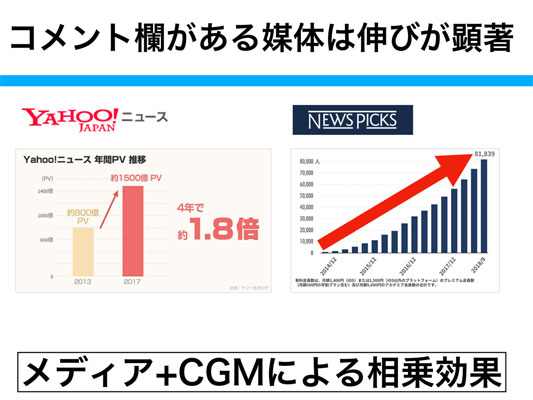 ブランドの確立と浸透には、関連記事に加えて、コメント欄も重要になってきています。Yahoo!ニュースやNewsPicksに人が集まるのは、単に情報発信しているだけでなく、コメント欄があるからという理由が大きいと考えています。記事の感想を共有し、それに共感したり反発したり、その書き込みにまた反応したり、とCGMの役割を果たしている。「メディア+CGM」の構造が、人を呼んでいます。