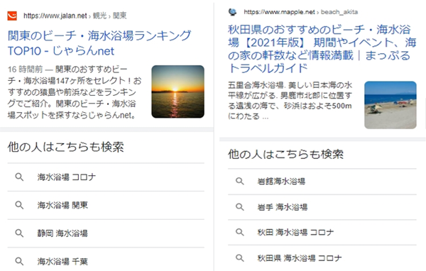 「他の人はこちらも検索」で表示されるキーワードは常に同じというわけではなく、検索するタイミングや位置情報によっても異なります。たとえば、「海水浴場」というキーワードであれば、東京から検索した際には、このように関東近郊のキーワードを表示しますが、秋田県から検索を行うと、秋田に関連したキーワードを表示します。