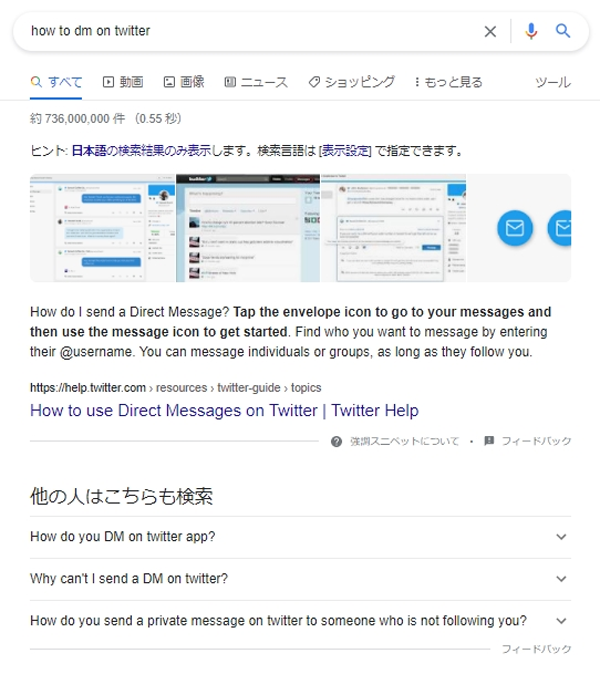 「海水浴場」の検索結果も位置情報を反映した結果になっていますが、「他の人はこちらも検索」のキーワードにおいても変化が見られます。また、日本語検索ではまだあまり見られませんが、「他の人はこちらも検索」が検索キーワードではなく、質問として表示されているケースもあります。
