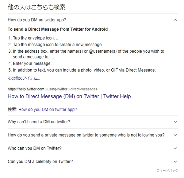 このタイプはそれぞれがアコーディオンになっており、クリックすると強調スニペットに近い形式で質問への回答とそのリンクが表示されます。なお、クリックすると、質問の個数が2つずつ増えていきます。