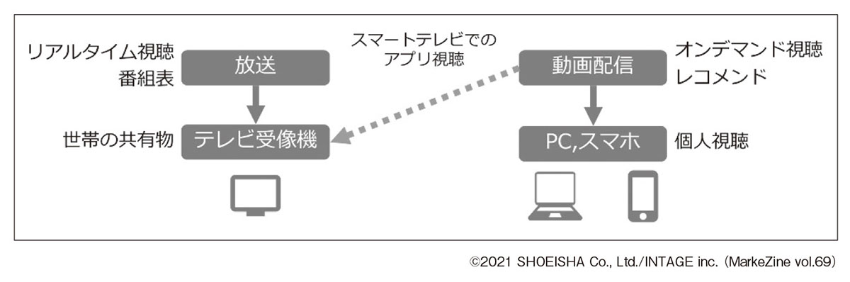 このようにテレビ受像機に放送とアプリという異なるサービスが混在するようになったことは、図表2のようなメディア視聴環境の変化として捉えることができるでしょう。