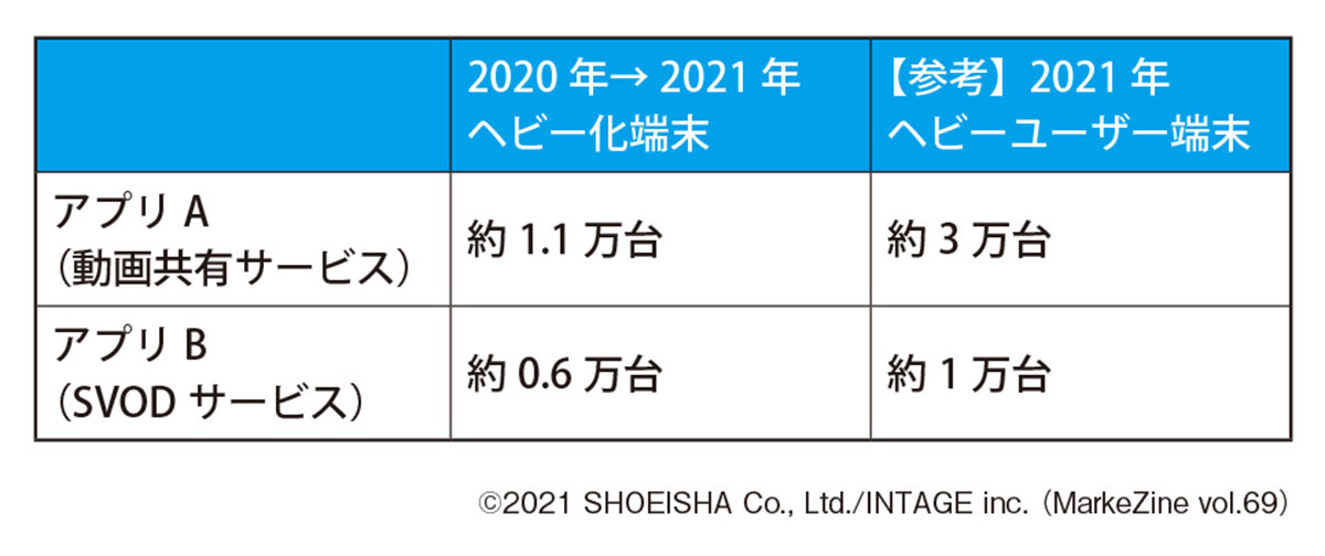 ここからは、独立U局(キー局の系列ネットワークに属さない放送局)やケーブルテレビなどを除いて放送のコンテンツが均質な東京、神奈川、埼玉、千葉の4エリア、約9万台の端末に限定し、アプリの視聴量の増加が放送の視聴に与える影響を見ていきます。分析対象のアプリとして、特に利用率の高い動画共有サービス(アプリA)と定額制で動画を配信するSVODサービス(アプリB)に着目し、これらのアプリの利用時間が増加した端末の放送に関する視聴傾向の変化を分析します。具体的には、それぞれのアプリの1日あたりの利用時間が1時間以上の端末をヘビーユーザー端末と定義し、2020年1〜3月から2021年1〜3月で新しくヘビーユーザー端末になった端末を“ヘビー化端末”と定義しました。このヘビー化端末と全体の端末で放送の視聴傾向の変化を比較することで、それぞれのアプリの視聴量増加が放送の視聴に与える影響を見ていきます。それぞれの端末数は以下の図表3のとおりです。