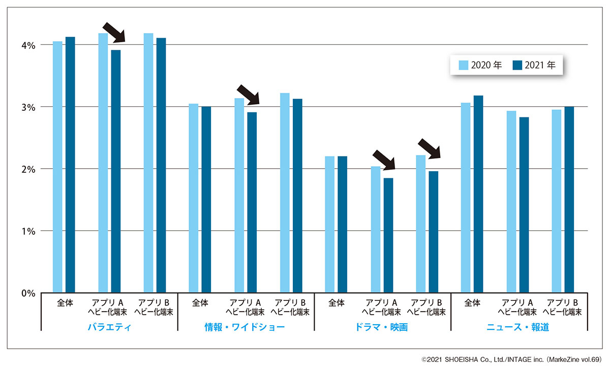 では、リアルタイム視聴という放送の特性と相性がよいと考えられるニュース・報道番組ではどうでしょうか。ニュース・報道番組はアプリAヘビー化端末ではわずかに低下、アプリBヘビー化端末では微増となりました。全体の端末ではニュース・報道番組は接触率が微増していることも考慮すると、ニュース・報道番組がアプリの視聴に代替されづらいジャンルとは言い切れないでしょう。放送局自身が動画共有サービスでニュースを配信する動きも活発になっていますから、動画共有サービスのニュースをスマートテレビで視聴することが放送でのニュースの視聴を代替していることも可能性として考えられます。