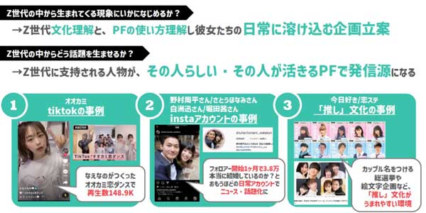 最後に3つ目は、「推しの文化」を用いた事例だ。『今日好き』などの番組から生まれた、「特定のカップルの恋愛が成就するよう応援する」という「カップル推し」がZ世代の中で文化として定着してきている。これを起点にさらに視聴者を巻き込むために、カップルに名前をつける総選挙を開催するなど、視聴者が参加できる場を設けているという。