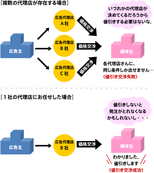 実は1つの広告代理店に絞り、任せる方が確実に媒体コストは安く抑えられるのである。