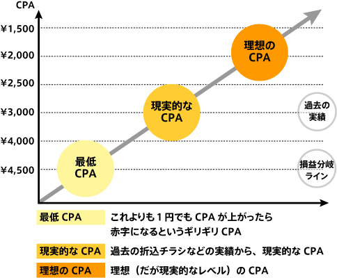- 現実的なCPA : 過去の他媒体(折込チラシなど)の実績から現実的なCPA