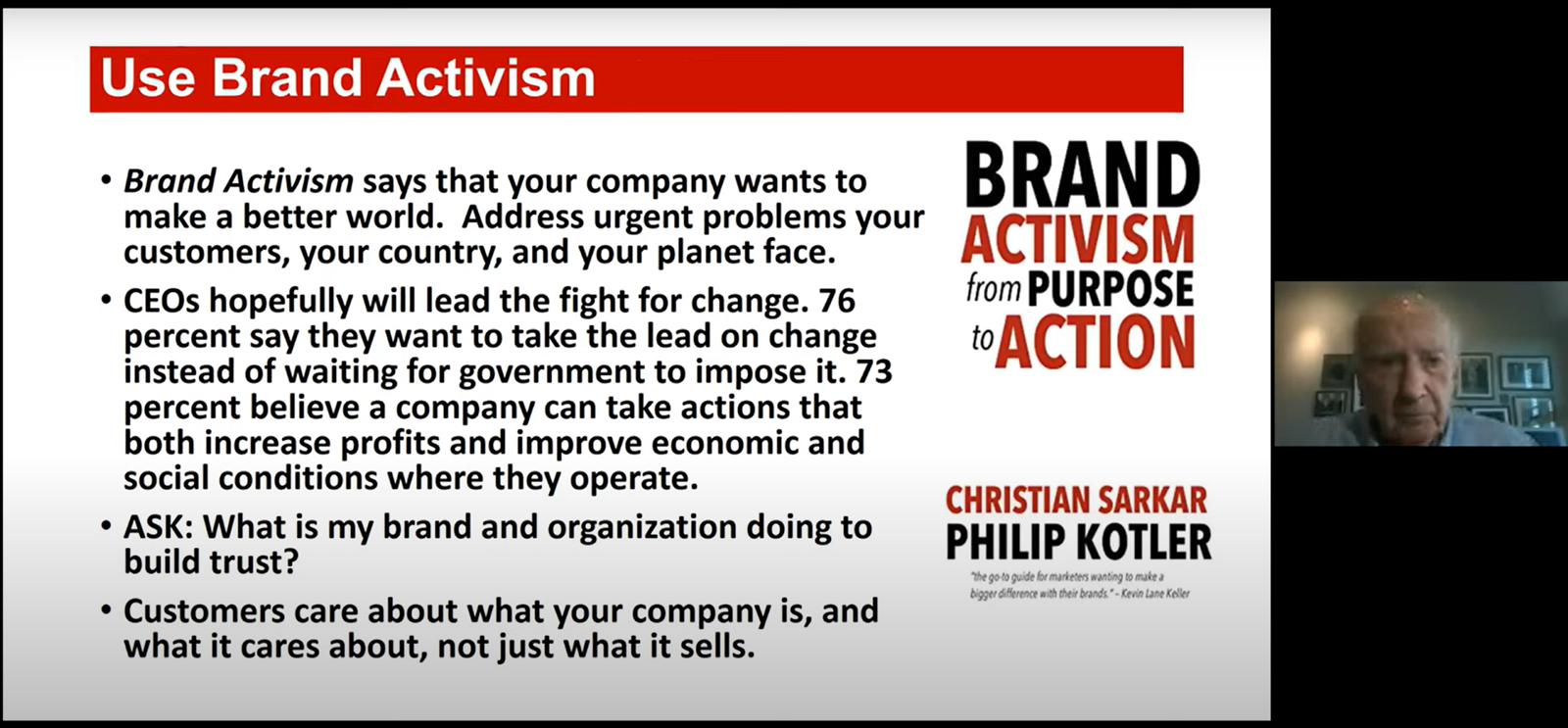 実際に、CEOの76%が政府を待たずに自ら変革を起こしたい、そして73%が企業は利益を上げて経済や社会を良くするアクションを起こせる、と回答したという。コトラー氏は、「ユニリーバしかり、利益と社会善は両立する」「企業はどうしたら信頼を勝ちえるか、より高次なパーパスとは何かを問わなければならない」と力を込め、消費者は企業が何を大切にしているかを見ている、と改めて強調した。