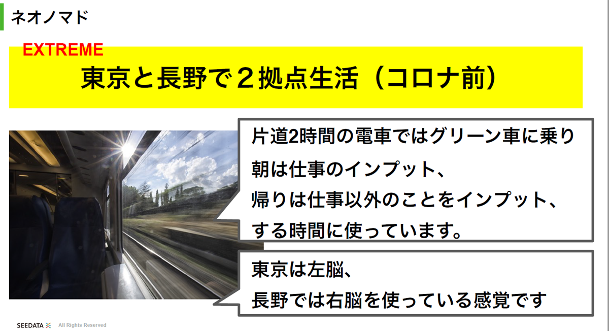 もうひとつトライブとして「ネオノマド」を紹介する。ネオノマドとは東京と長野など、生活拠点を2ヵ所持って暮らす人々のことだ。彼らに2拠点生活のメリットを尋ねたところ、以下のような答えが得られたという。