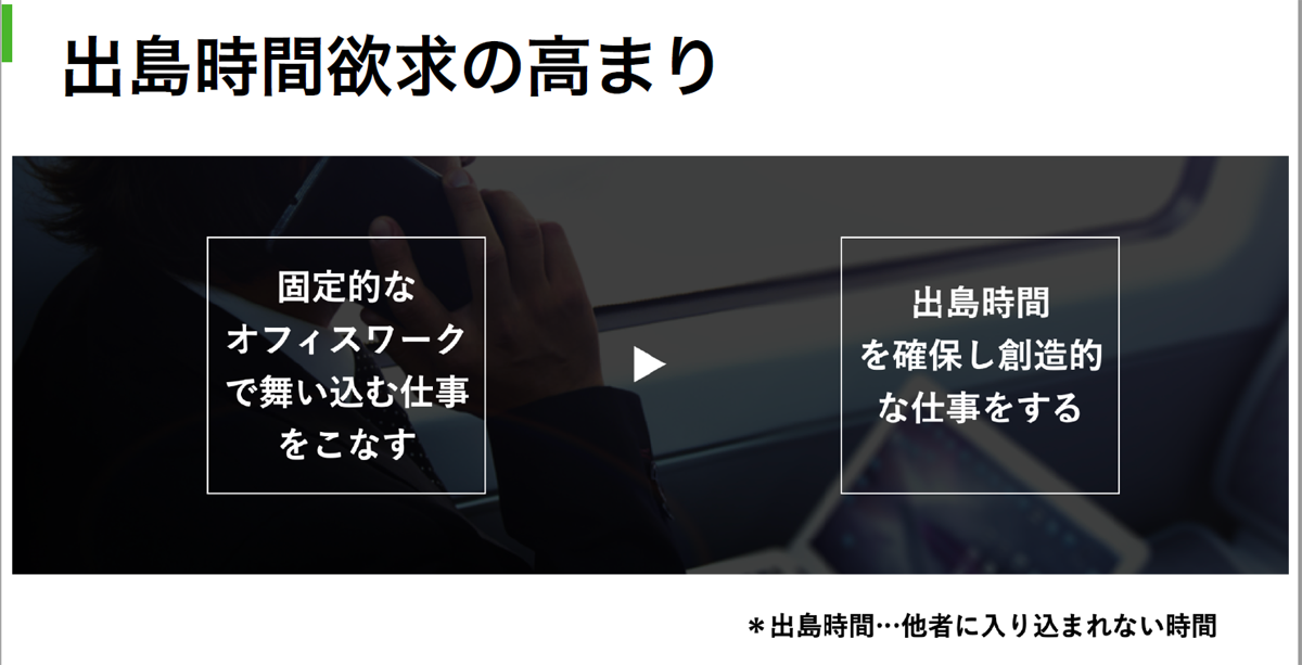 片道2時間の移動時間を有効活用する様子から、林氏はこのトライブを「出島時間」の欲求と分析する。「出島時間」とは、他者に入り込まれない時間のこと。静かに本を読んだり、考えごとをしたり、戦略を練ったりする時間に価値を感じ、日々の中に確保したい人が増えているのだという。