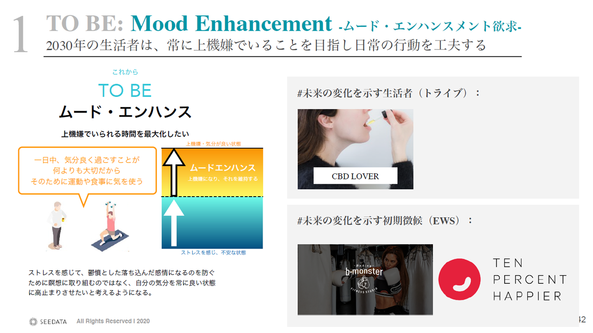 SDGでは「2030年の生活者は常に上機嫌でいることを目指し日常の行動を工夫する」と予測し、それをムードエンハンス欲求と呼ぶ。
