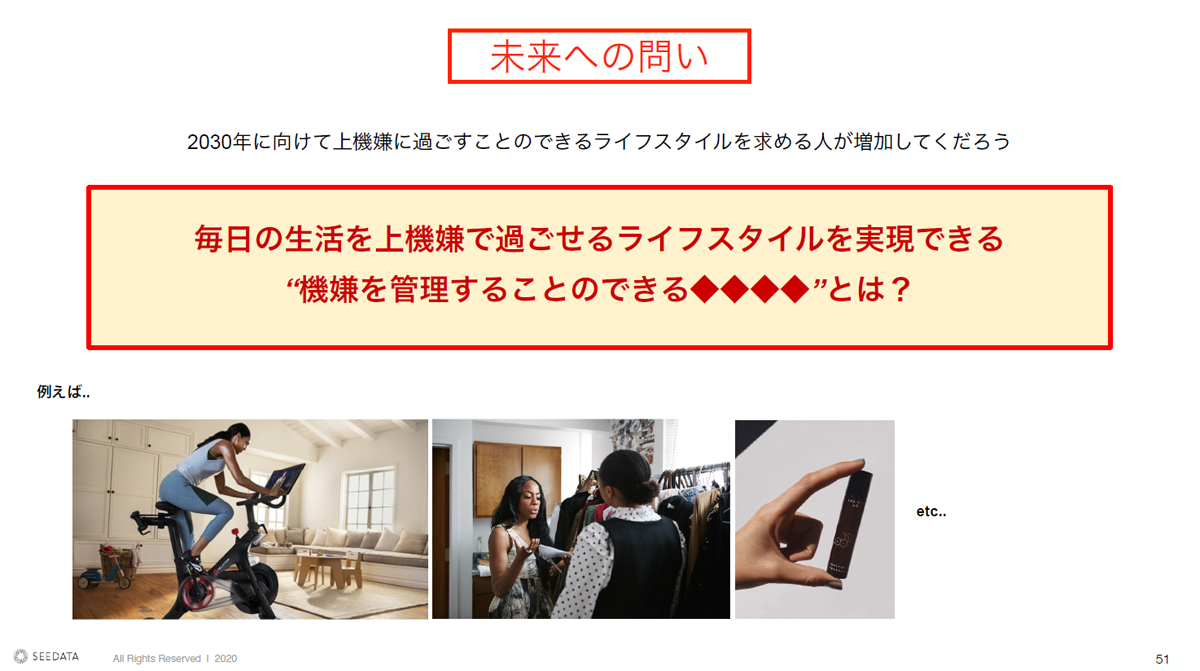 「新しい価値観を頭に入れて流行っている商品やサービスを捉え直すと、今までとは違う視点で自社製品や技術の活用法が見えてくるのが、トライブリサーチのポイントです。上機嫌で過ごすことができる○○とは? という視点で考えてみると、新たな発想が生まれるかもしれません」(林氏)