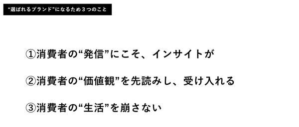 猿田氏は一連の取り組みを振り返り、選ばれるブランドになるためのポイントとして次の3つを挙げた。
