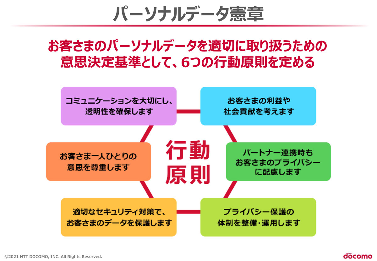 パーソナルデータ憲章の初期検討は2017年に開始された。まずは経営幹部が参加するワークショップにおいて「『ドコモらしい』データ利活用の在り方」を議論し、原案を作成。続いて有識者会議において、その内容が法制度の理念や目的を踏まえたものか、社会一般の感覚に照らして適切なものであるかが検討され、2018年5月に制定。社内での運用期間を経て、2019年8月に対外的に発表された。
