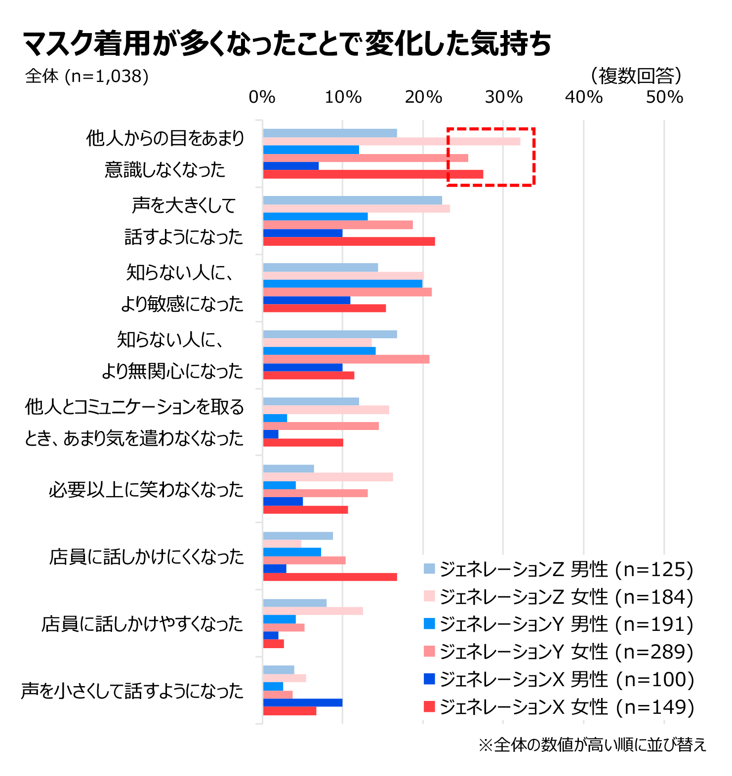 日常的にマスクを着用することによって、人々の内面にはどのような変化があったのでしょうか? 以下のグラフは、マスクの着用が多くなったことによって起こった気持ちや意識の変化を性世代別に表したものです。