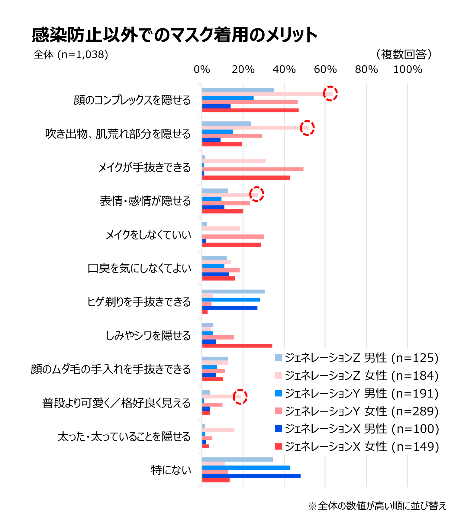 特に、Z世代の女性は感じているメリットが多いことがわかります。「顔のコンプレックスを隠せる」は63.6%、「吹き出物、肌荒れ部分を隠せる」は52.2%、「表情・感情が隠せる」は27.2%にのぼります。