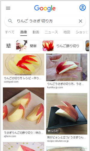 チャーハンのレシピなどは、画像検索はしないかもという人も多いかもしれませんが、「りんご うさぎ 切り方」などのビジュアルが欲しい場合などは画像検索する方もいるのではないでしょうか。