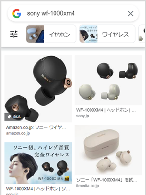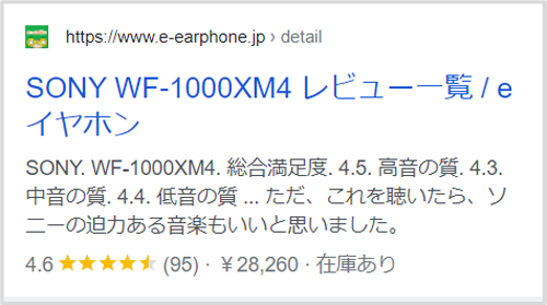 下記はソニーのワイヤレスイヤホンに関する検索結果です。検索結果上にレビューと価格、そして在庫の有無が表示されています。これは構造化データ「Product(商品)」を付与したことで、表示されたリッチリザルトです。