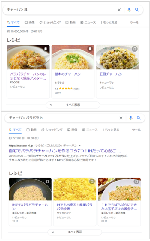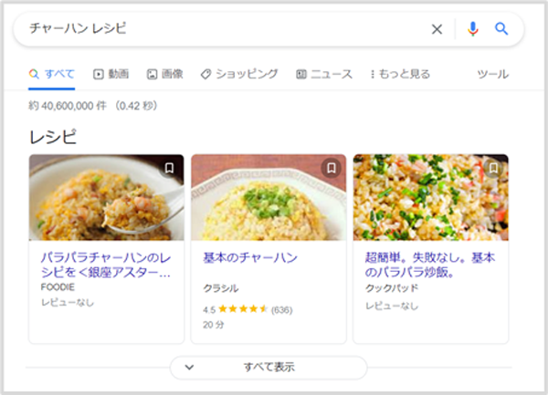 「チャーハン パラパラ ih」などのロングテールキーワードでも表示されますので、レシピ系サイトだけでなく、家事など全般的に扱うサイトを運営される方は、ターゲットとするキーワードで、レシピが検索結果に表示されないか確認してみてください。