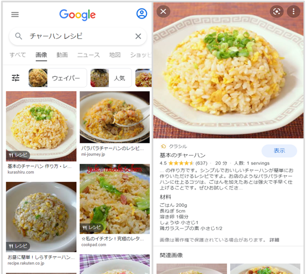 2つ目のメリットは画像検索結果にバッジやレシピ情報が表示される点です。「Product(商品)」同様、レシピの構造化データにおいても、画像検索結果上にバッジが表示されます。また画像をクリックすると、レシピのレビューや調理時間、レシピ内容の抜粋、材料などが表示されます。