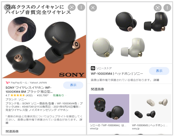 先ほどの検索結果同様、レビュー、価格そして在庫の有無のほか、ブランドの情報やちょっとした商品の紹介が記載されています。商品の情報が表示されない場合、上記右図のような画像だけの表示になりますので、こちらもクリック率の向上などが期待できます。