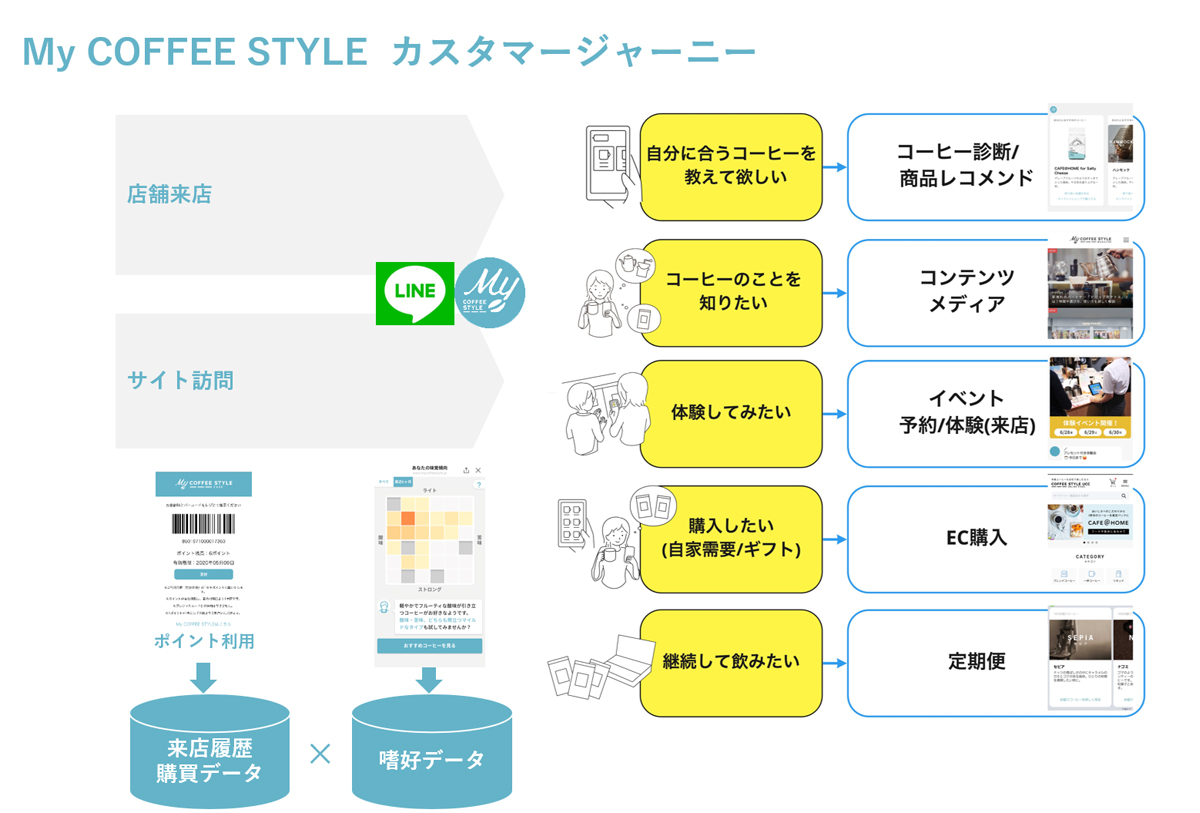 「D2Cは企業がお客様と接点を持ち、直接関わろうとするところから始まり、商品自体のパーソナライズが必要」と奥谷氏。その言葉通り、「My COFFEE STYLE」には、会員とのタッチポイントが複数用意されている。