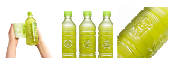 ラベルを剥がしたペットボトル本体にも、伊右衛門らしさが失われないように、伊右衛門のシンボルである「丸茶」マークや縁起物のイラストがエンボス加工で4面に施されている。