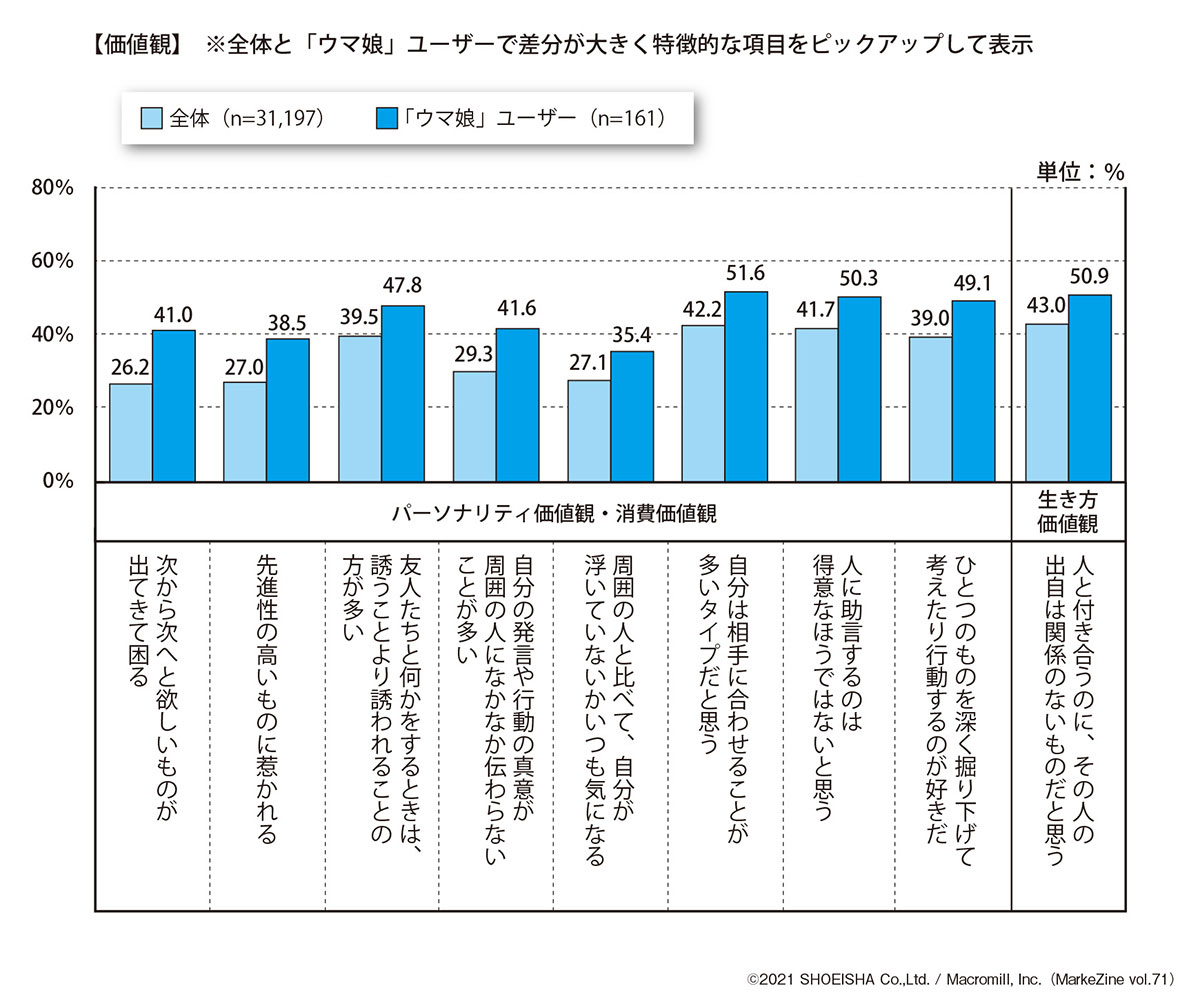 次に、「ウマ娘」ユーザーの価値観やメディア接触について見ていこう。図表5は、価値観の質問で特徴的な項目をピックアップしたものである。