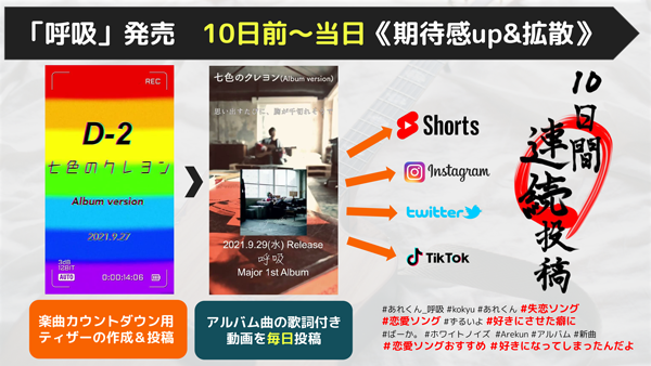 大津:10日前から当日までは期待感アップと拡散を狙って、毎日アルバム収録曲の歌詞付き動画を各種プラットフォームに投稿しました。全体を通して動画制作は全員が担当し、スケジュールもタイトでしたが、土谷さんが事前にあれくんのブランディングに沿ったかたちで、使用する書体や色味をまとめてくれていたので、テイストのバラつきもなく、非常にスピーディーに実施できました。