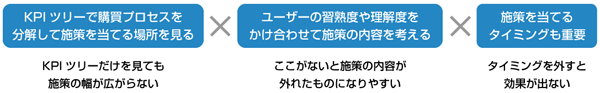ここまでの話を整理しましょう。KPIツリーを補完する考え方として、次の3つがCVR改善の施策を考える上で重要な要素として挙げられます。