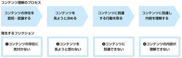 コンバージョンまでのプロセスについて特定箇所での離脱にフォーカスしたり、ファネルを考えたりした後、それぞれのプロセスでユーザーの理解度や習熟度とあわせてどのようなフリクション(衝動)が起きているかを考えることで、具体的な施策をイメージしやすくなるわけです。